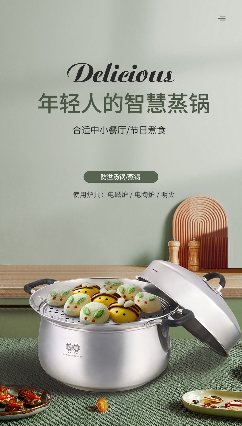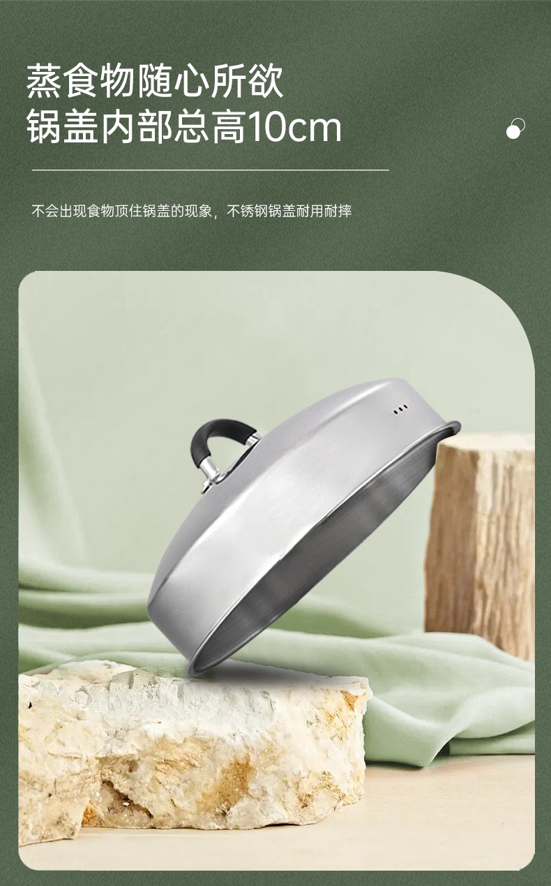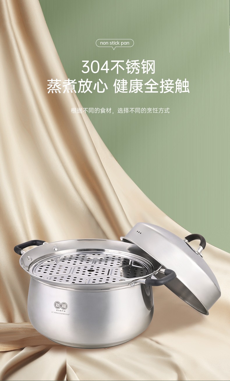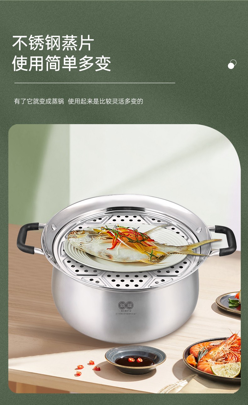 304不锈钢材料制造,创新专利锅边,出现溢锅情况锅边会把水挡住并流回锅内,避免溢锅到处喷的乱象。锅体容量大,满足过节人多聚会需求,配上蒸片实现一锅多用,同时上蒸下煮,304不锈钢的高拱型锅盖让蒸格层空间更大不受限制,使用更灵活。同时配备了不锈钢硅胶防烫锅耳,端锅安全实用。