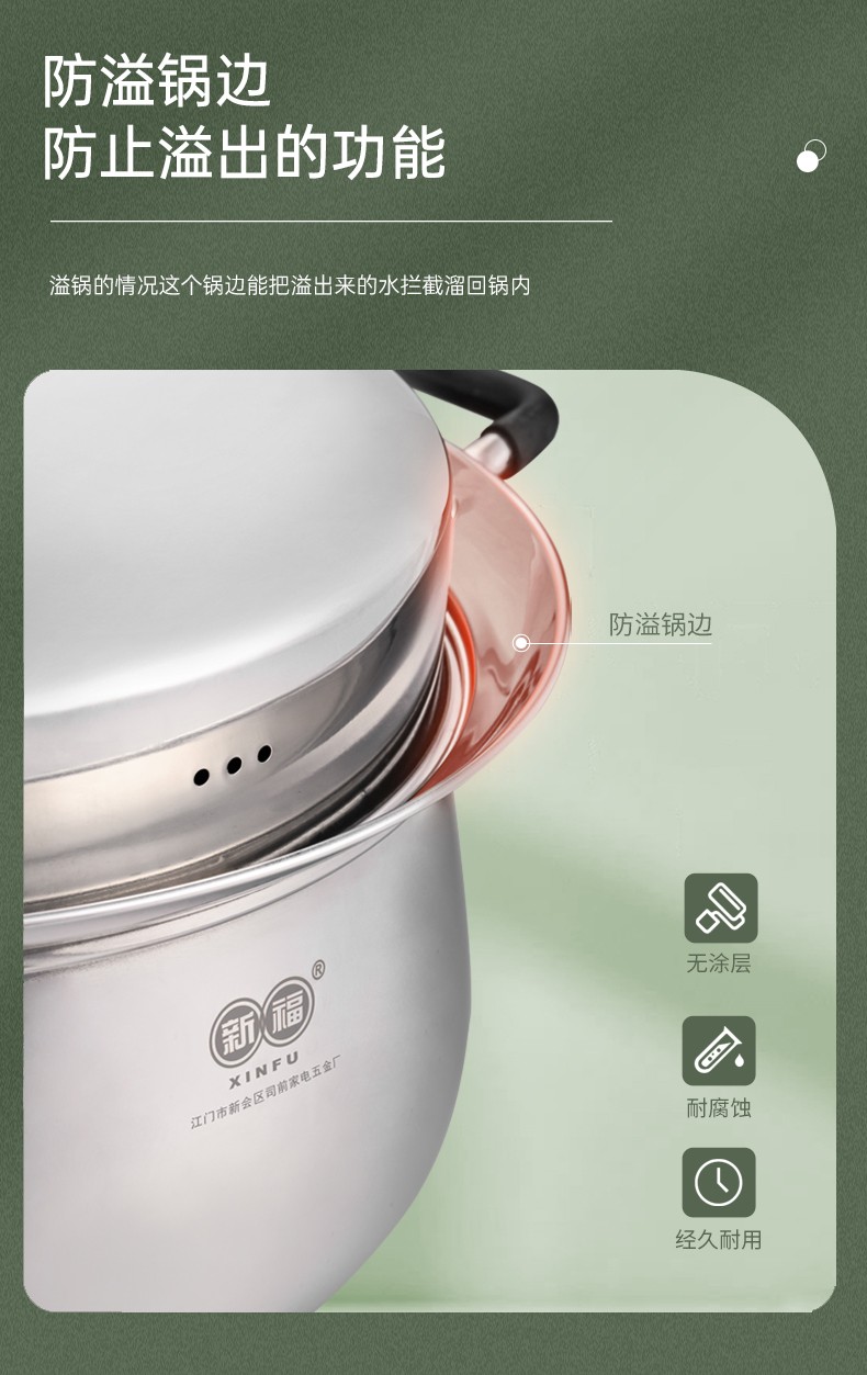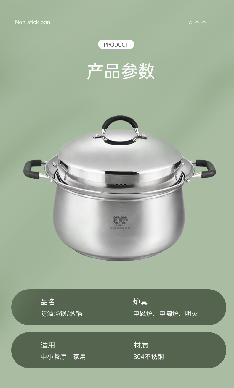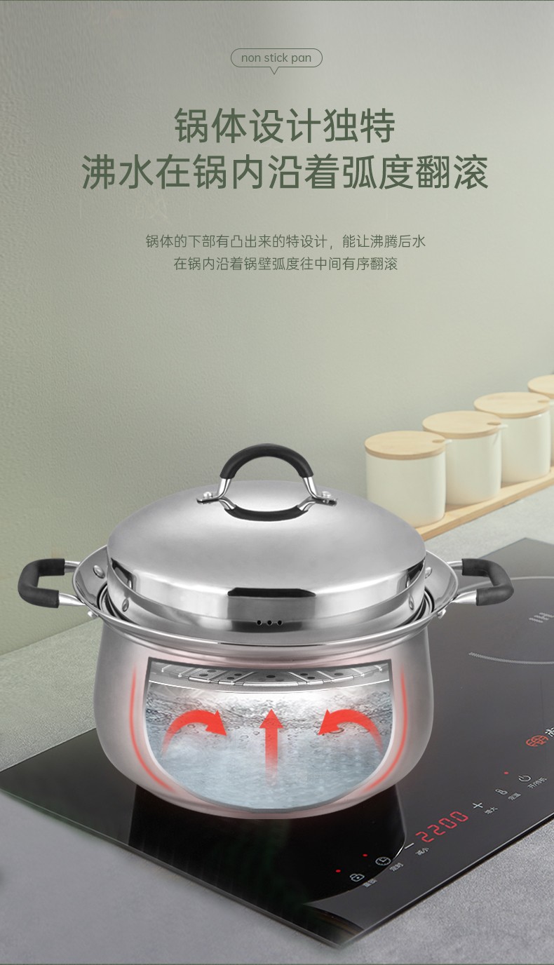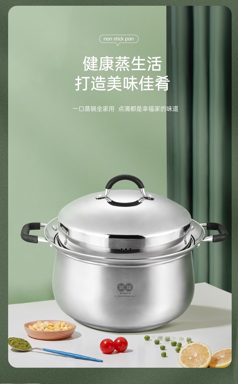 304不锈钢材料制造,创新专利锅边,出现溢锅情况锅边会把水挡住并流回锅内,避免溢锅到处喷的乱象。锅体容量大,满足过节人多聚会需求,配上蒸片实现一锅多用,同时上蒸下煮,304不锈钢的高拱型锅盖让蒸格层空间更大不受限制,使用更灵活。同时配备了不锈钢硅胶防烫锅耳,端锅安全实用。