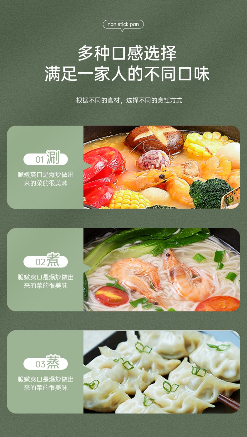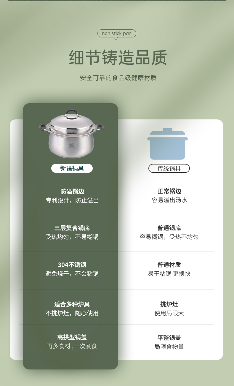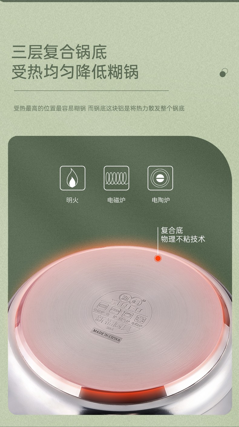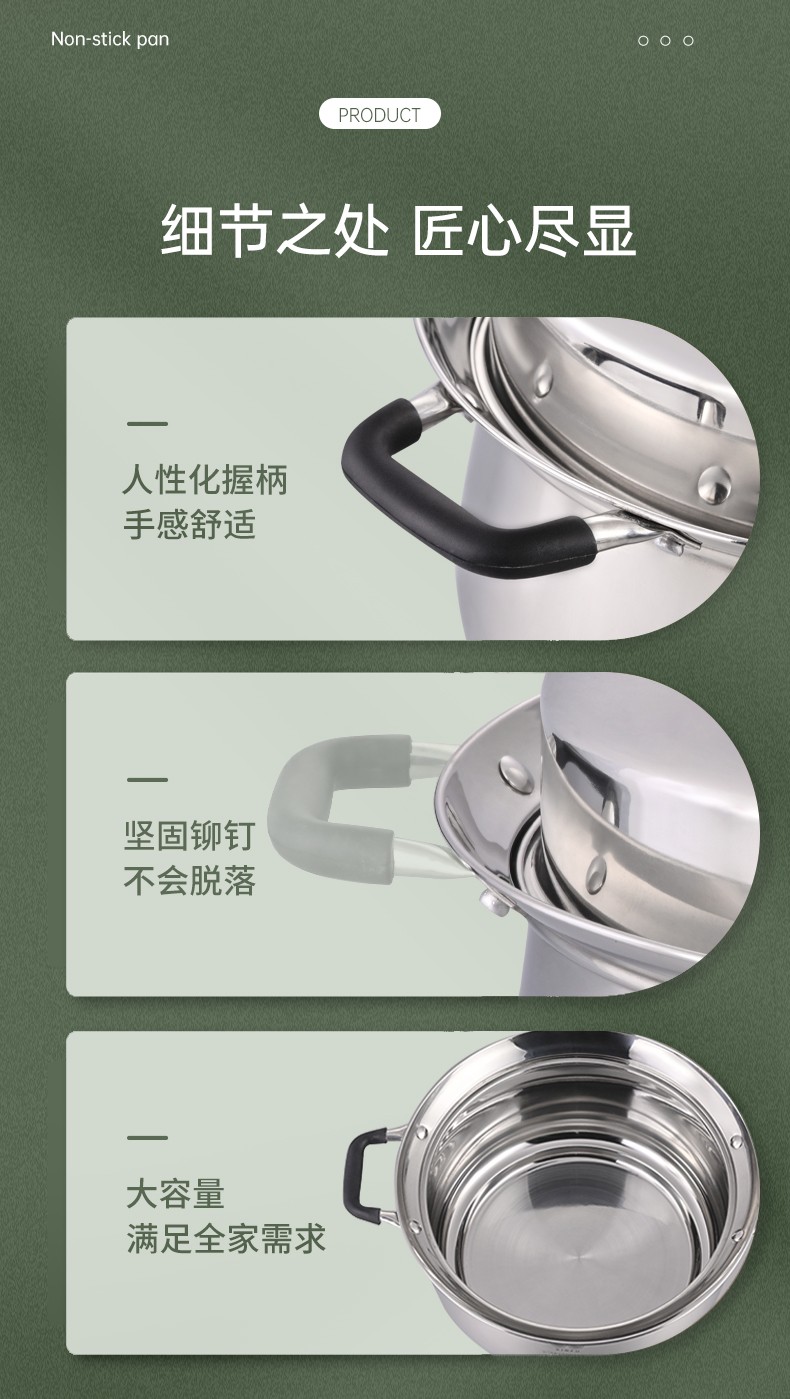 304不锈钢材料制造,创新专利锅边,出现溢锅情况锅边会把水挡住并流回锅内,避免溢锅到处喷的乱象。锅体容量大,满足过节人多聚会需求,配上蒸片实现一锅多用,同时上蒸下煮,304不锈钢的高拱型锅盖让蒸格层空间更大不受限制,使用更灵活。同时配备了不锈钢硅胶防烫锅耳,端锅安全实用。