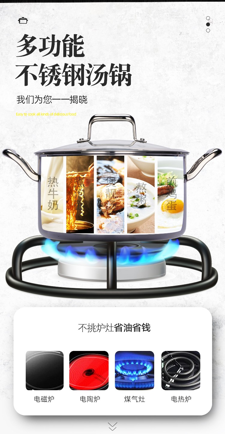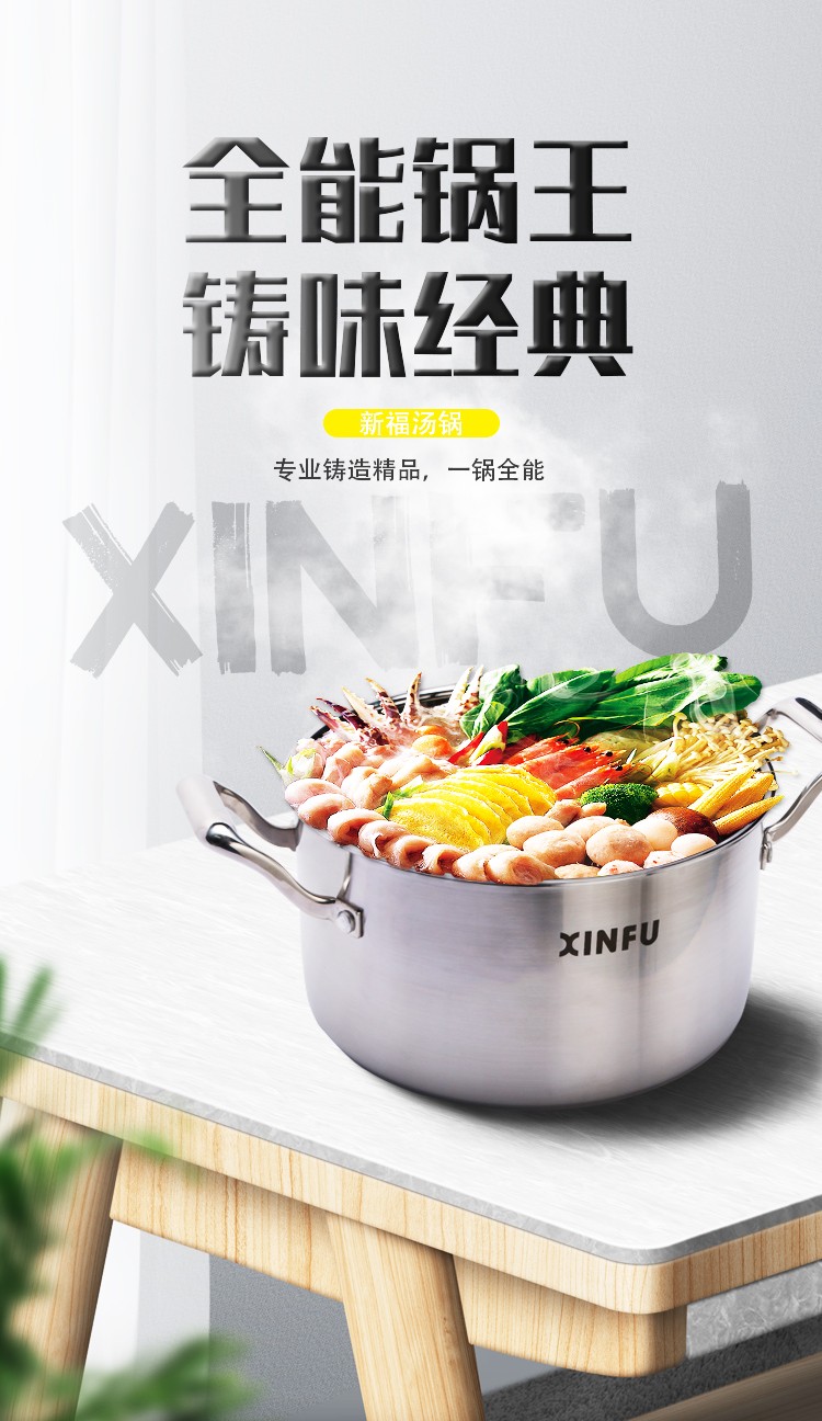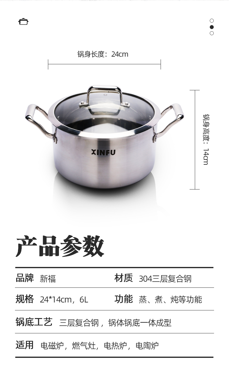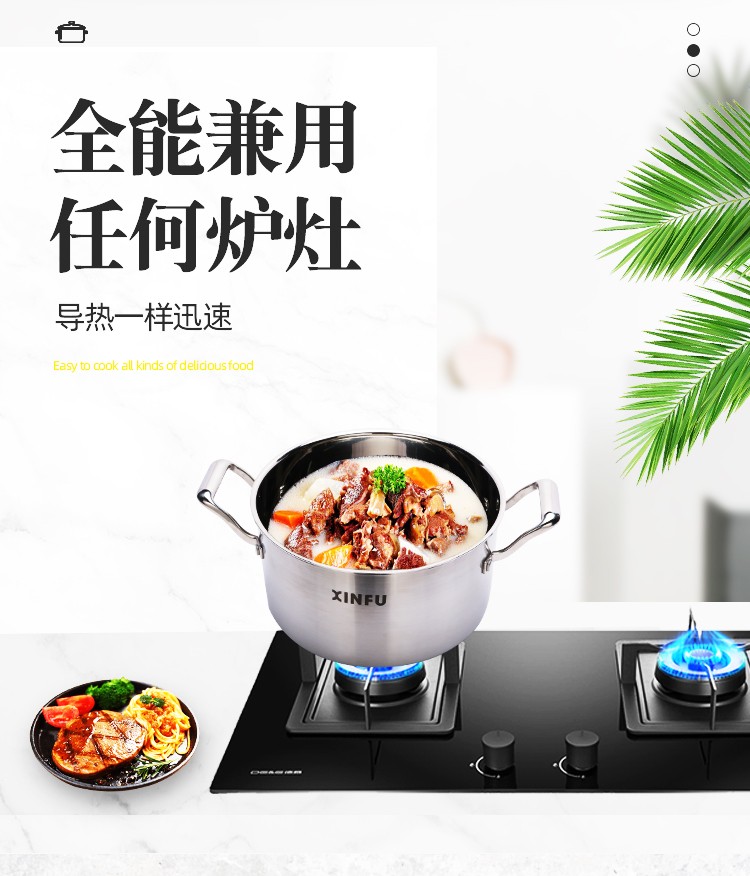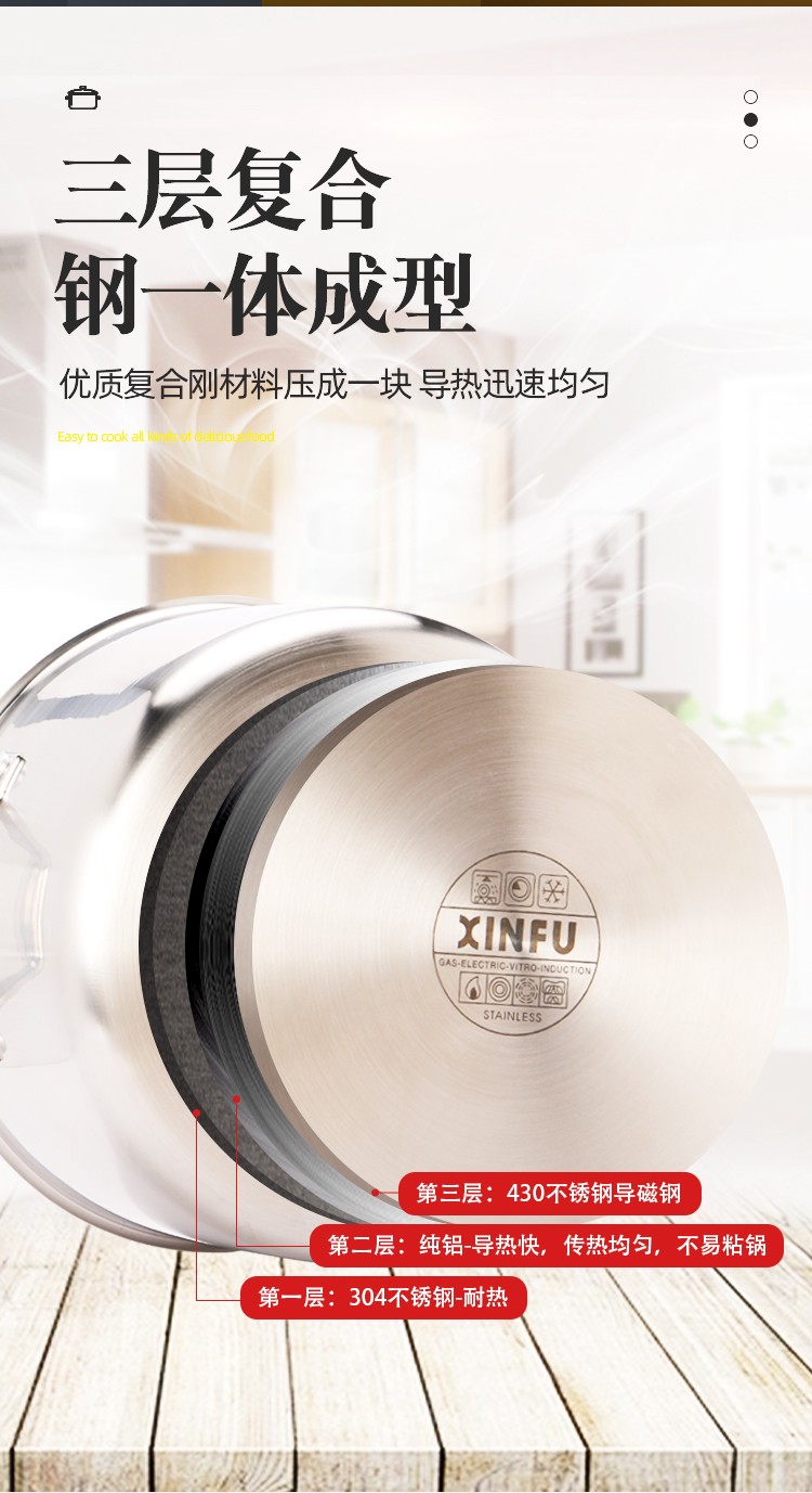 ●采用复合型材料一体拉伸成型,三层材料组成,由304不锈钢层+纯铝层+导磁钢层组合经过延压工艺成一块整体材料,这样称之为复合钢材料,一般用作于制造高品质、高档次产品,国际高端大品牌比较常用的一种材料。