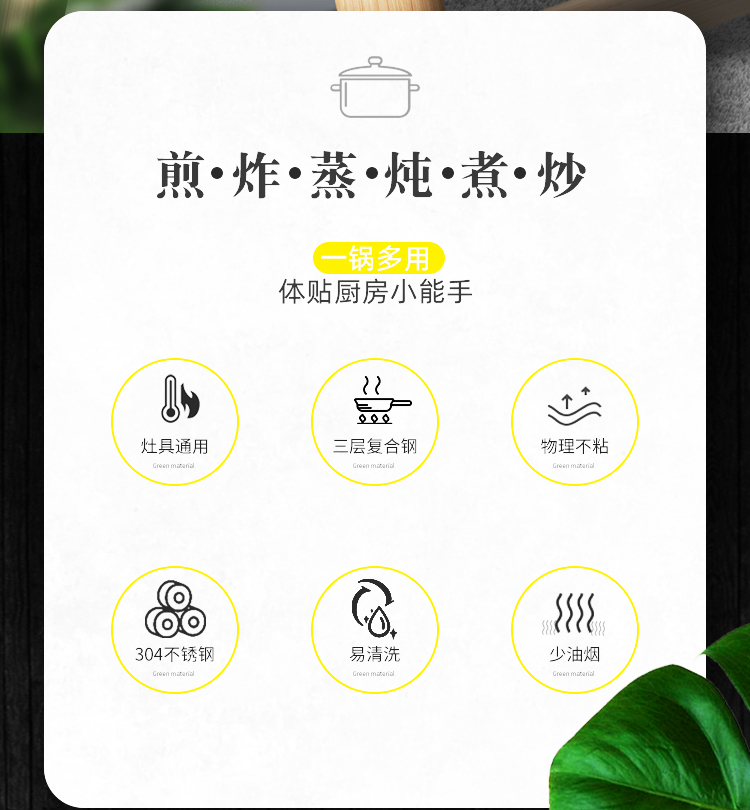 ●锅体复合钢材料让锅体加热快、导热均匀,从而达到物理不粘效果,停止加热后能较长时间保温,热量不会快速散发。