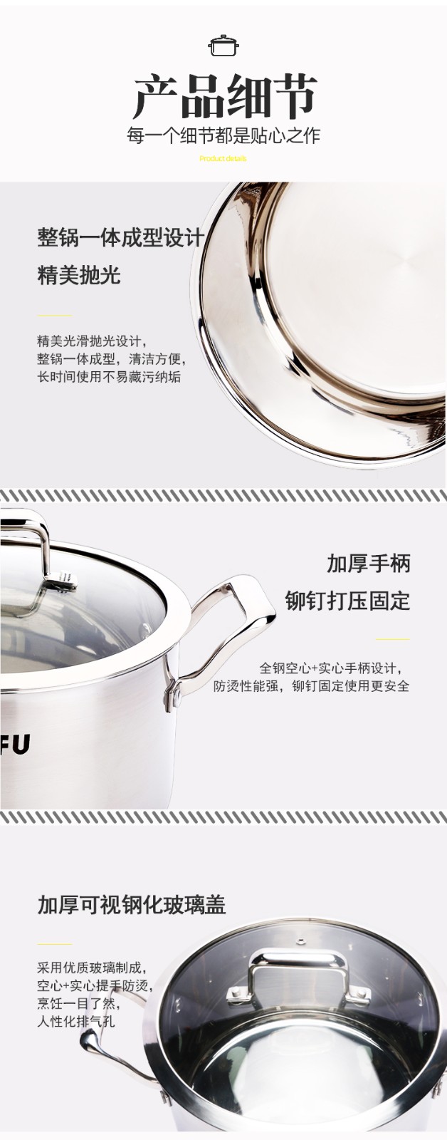 ●不锈钢铸造手柄,实心+空心+实心分段制造工艺,很好的形成传热断层,从而达到手柄隔热不烫效果。