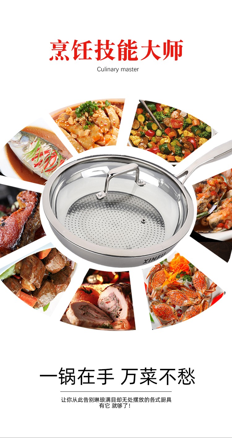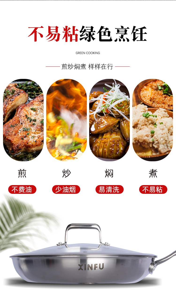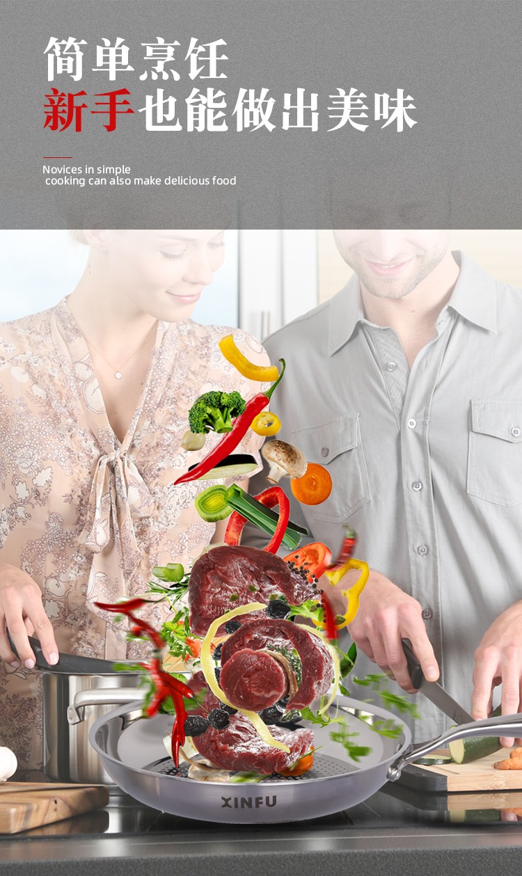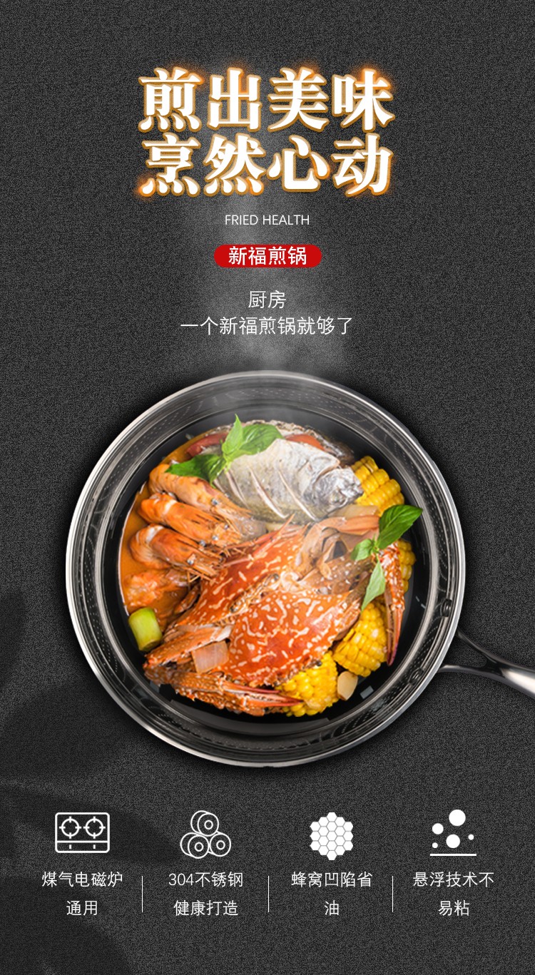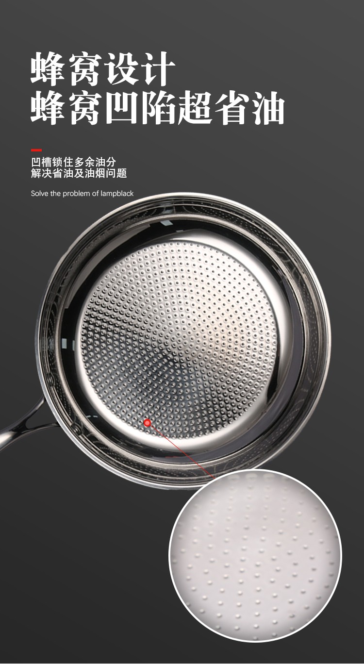 ●煎锅采用了物理不粘技术,蜂窝网状设计,锁住油份不被快速吸收,从而实现少油少烟不粘效果,无涂层健康实用,体现生活美好品质。