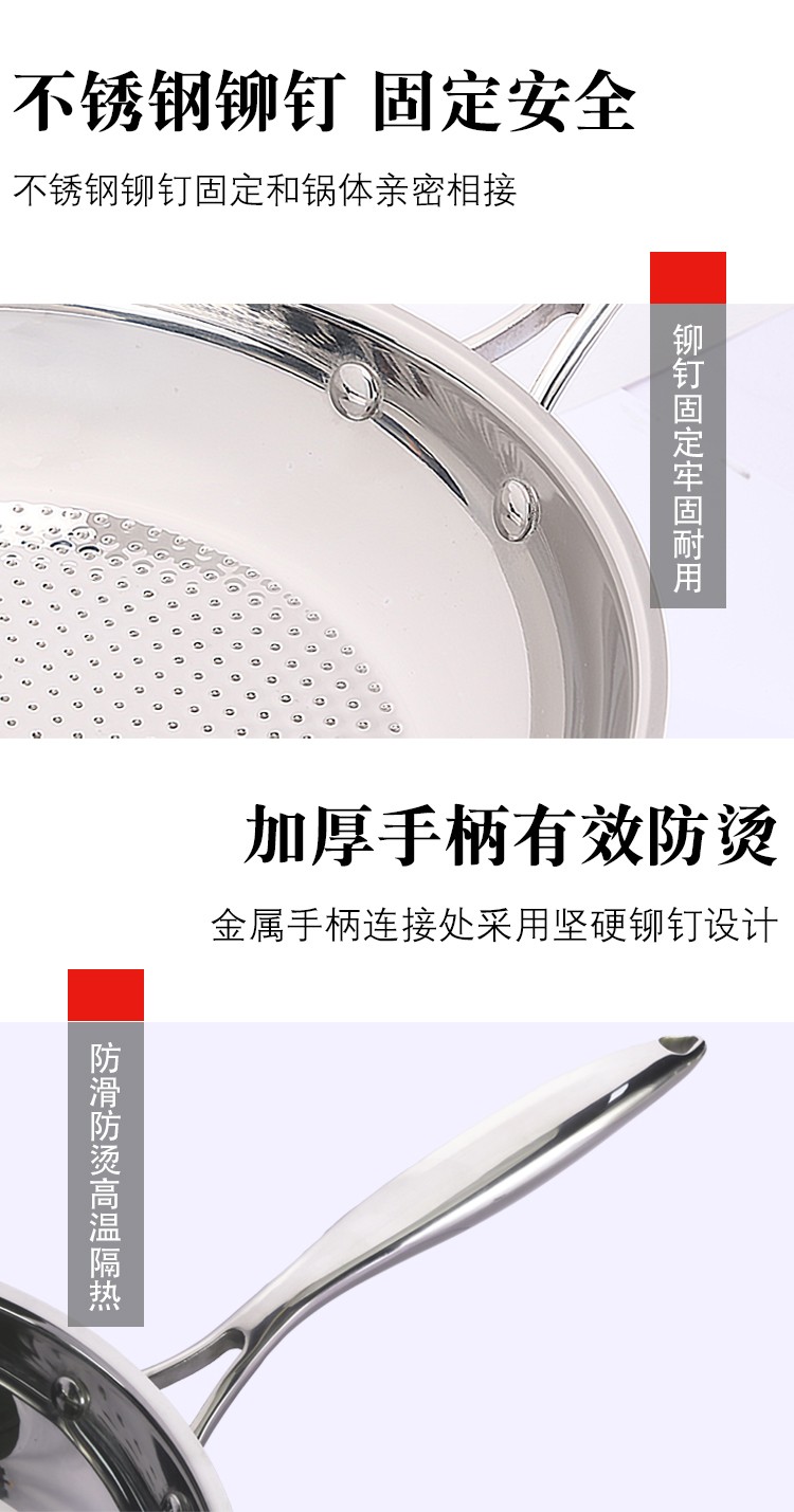 ●不锈钢铸造手柄,实心+空心+实心分段制造工艺,很好的形成传热断层,从而达到手柄隔热不烫效果。