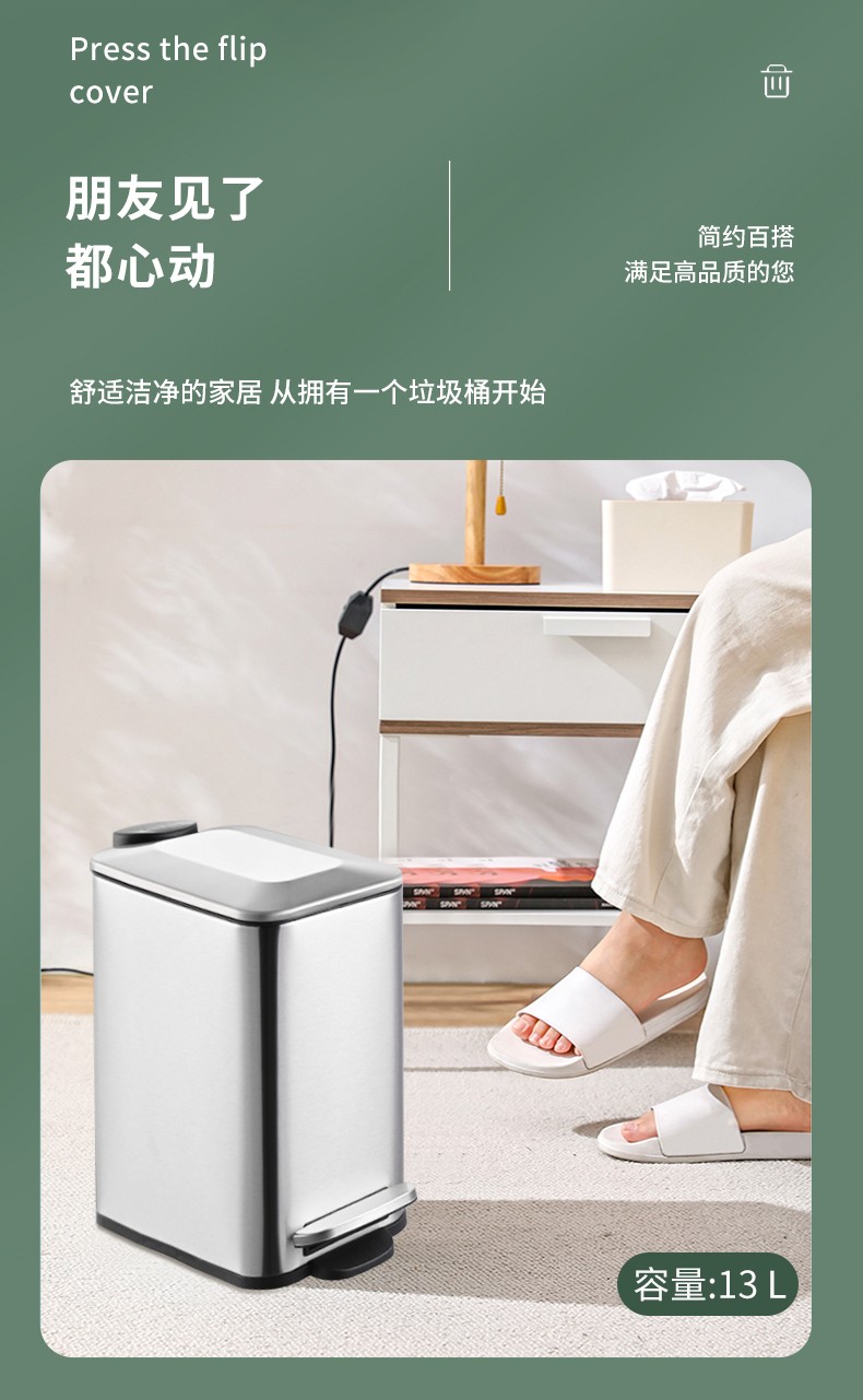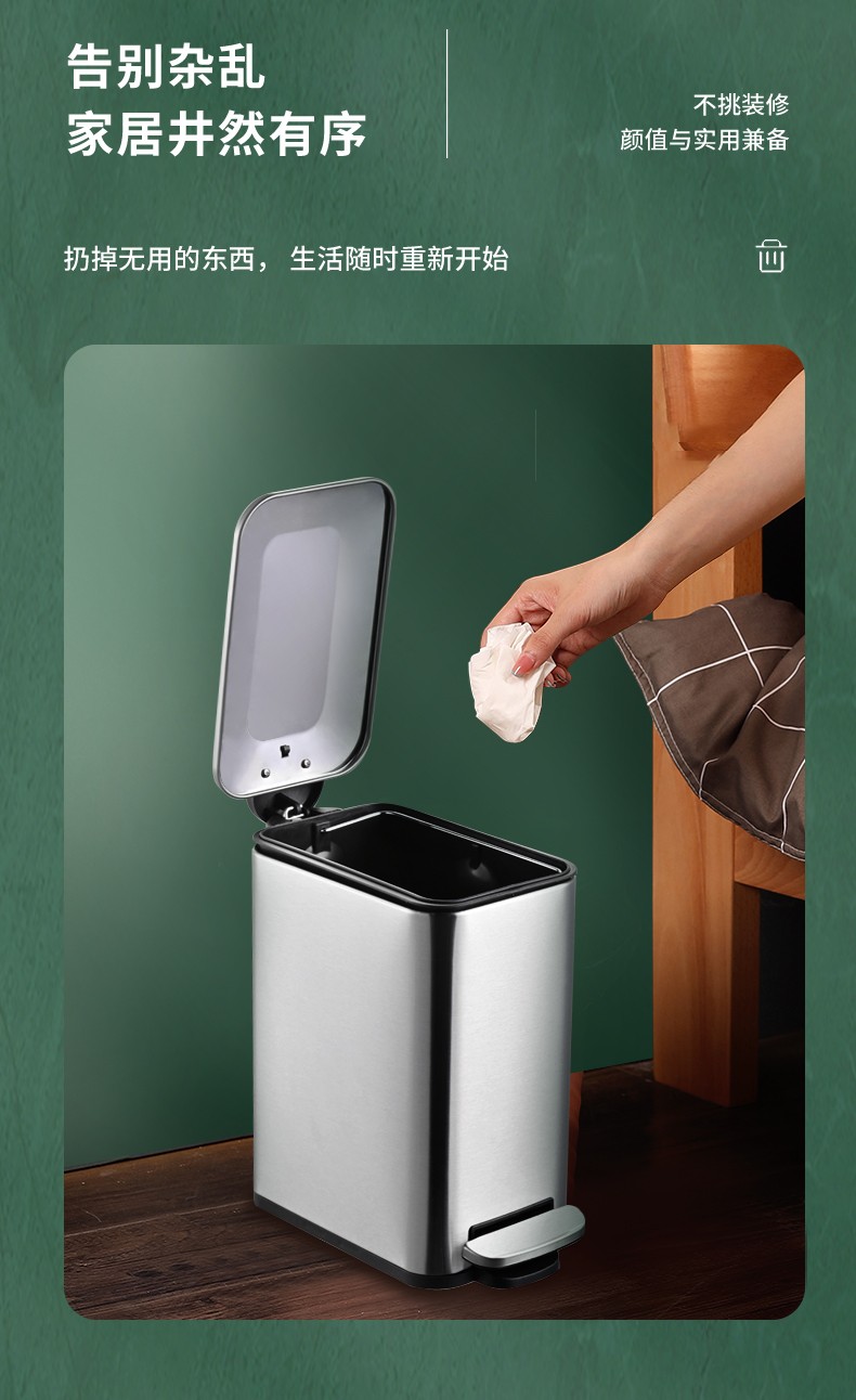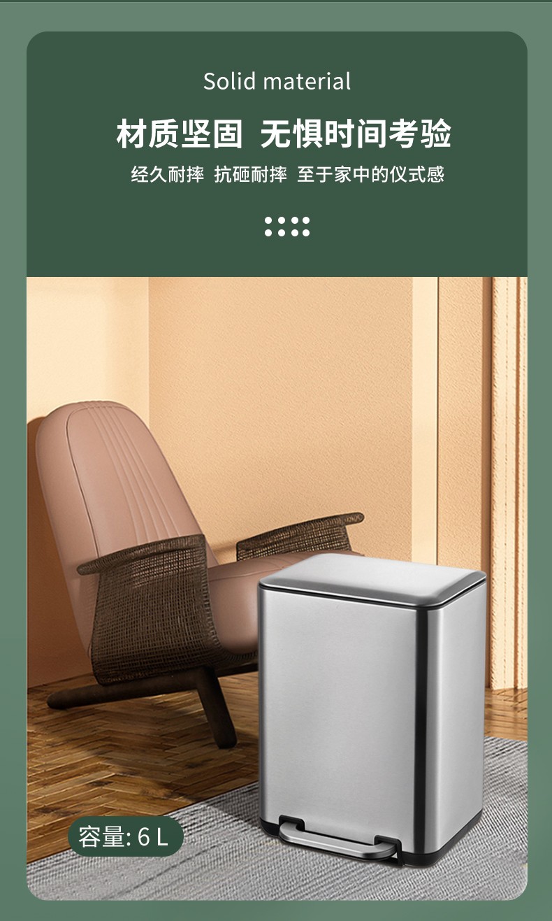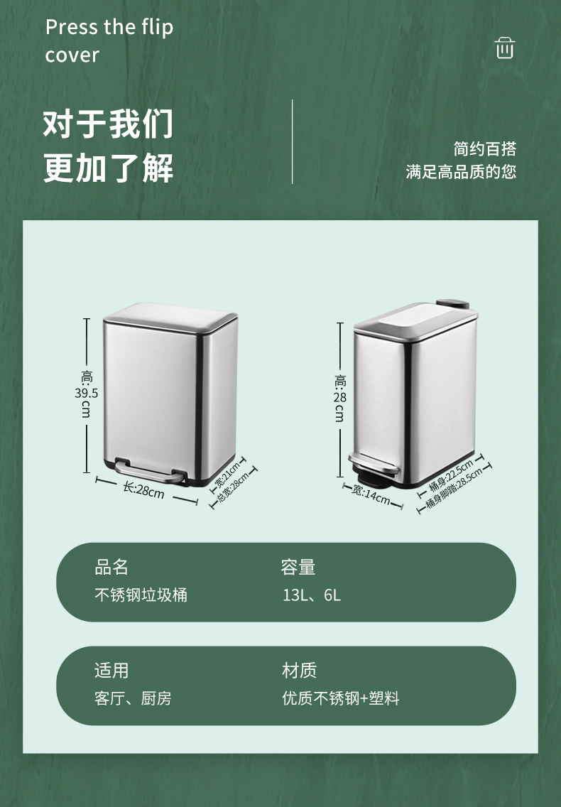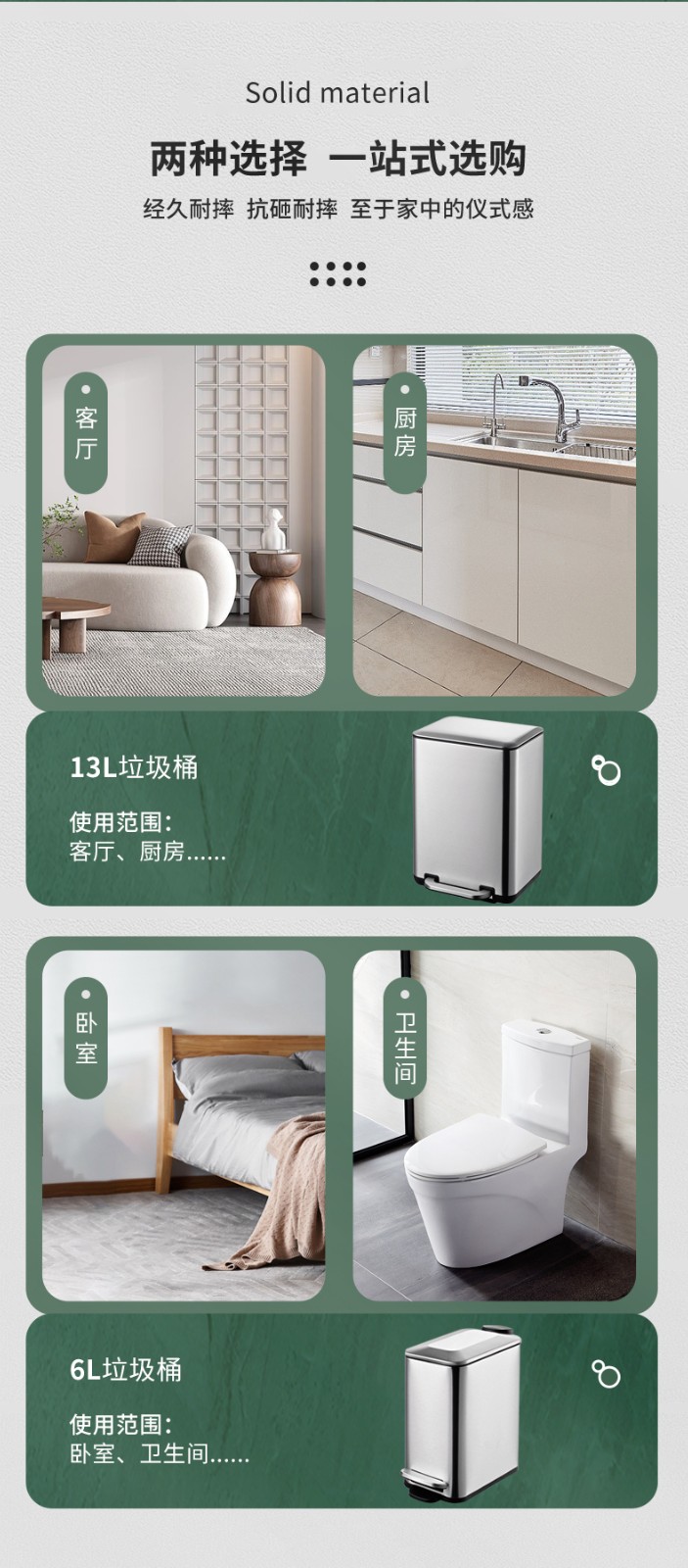 ●不锈钢材质的脚踏式垃圾桶,款式高端大气,大号13L适合在客厅、厨房、办公室、酒店客房使用,小号6L合适在卫生间、卧室使用,两种尺寸已覆盖大部分场景,放哪都显得那么的高档和适用。