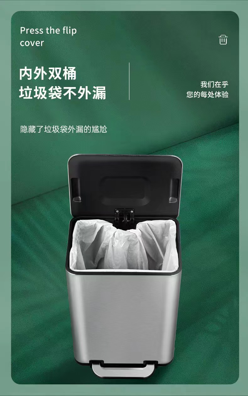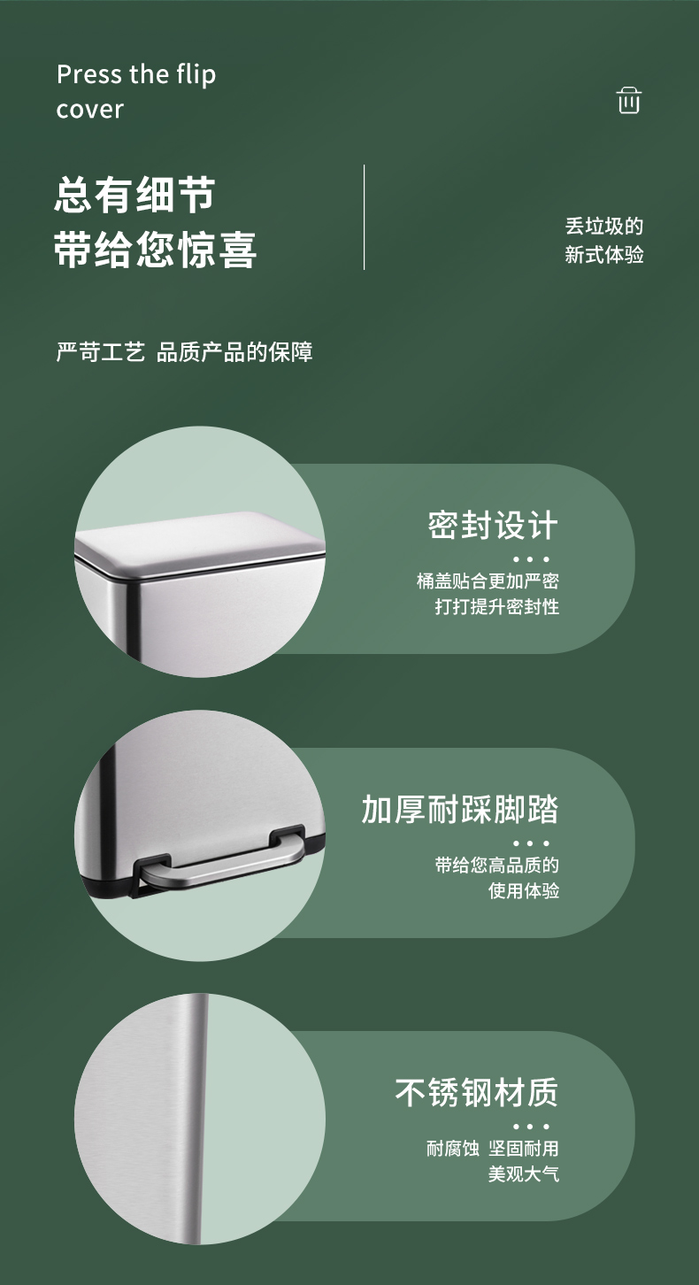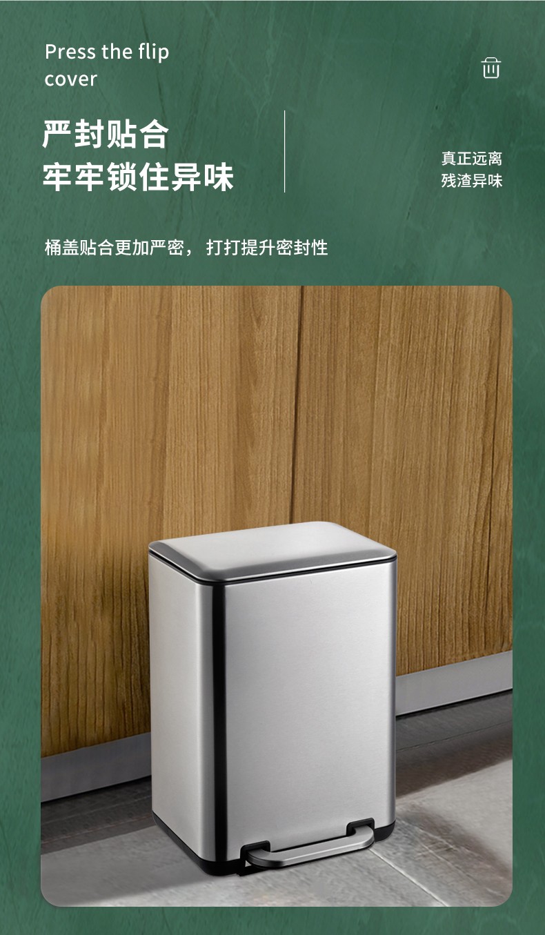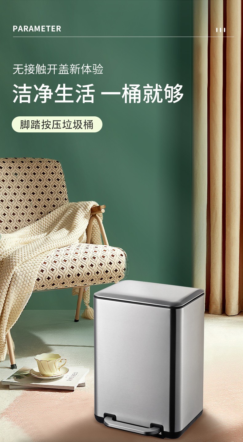 ●不锈钢材质的脚踏式垃圾桶,款式高端大气,大号13L适合在客厅、厨房、办公室、酒店客房使用,小号6L合适在卫生间、卧室使用,两种尺寸已覆盖大部分场景,放哪都显得那么的高档和适用。