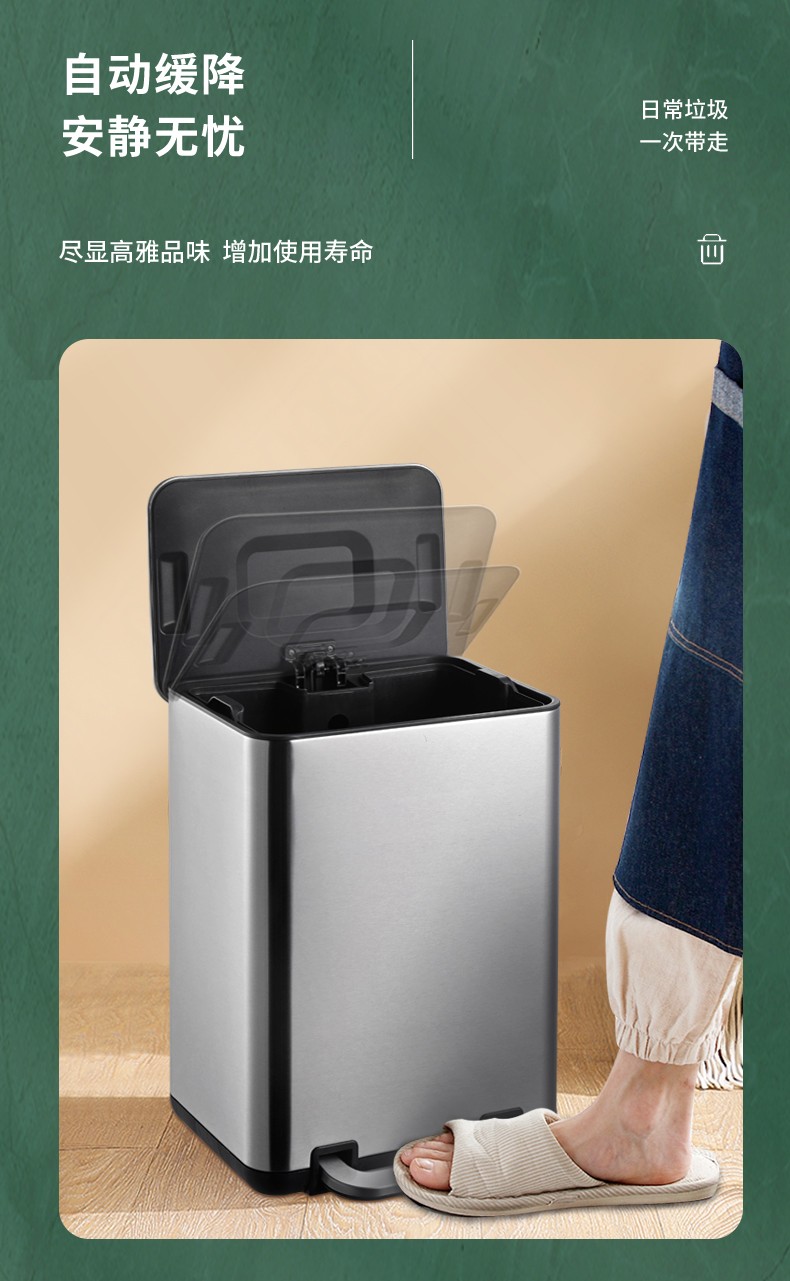 ●脚踏一踩,桶盖快速打开,实现0等待扔垃圾。桶盖配置了缓降功能,脚一放桶盖慢慢下降至盖好,静音不打扰,紧密无异味。桶盖还有定盖功能,为更换垃圾袋提供更方便更快速的便利。