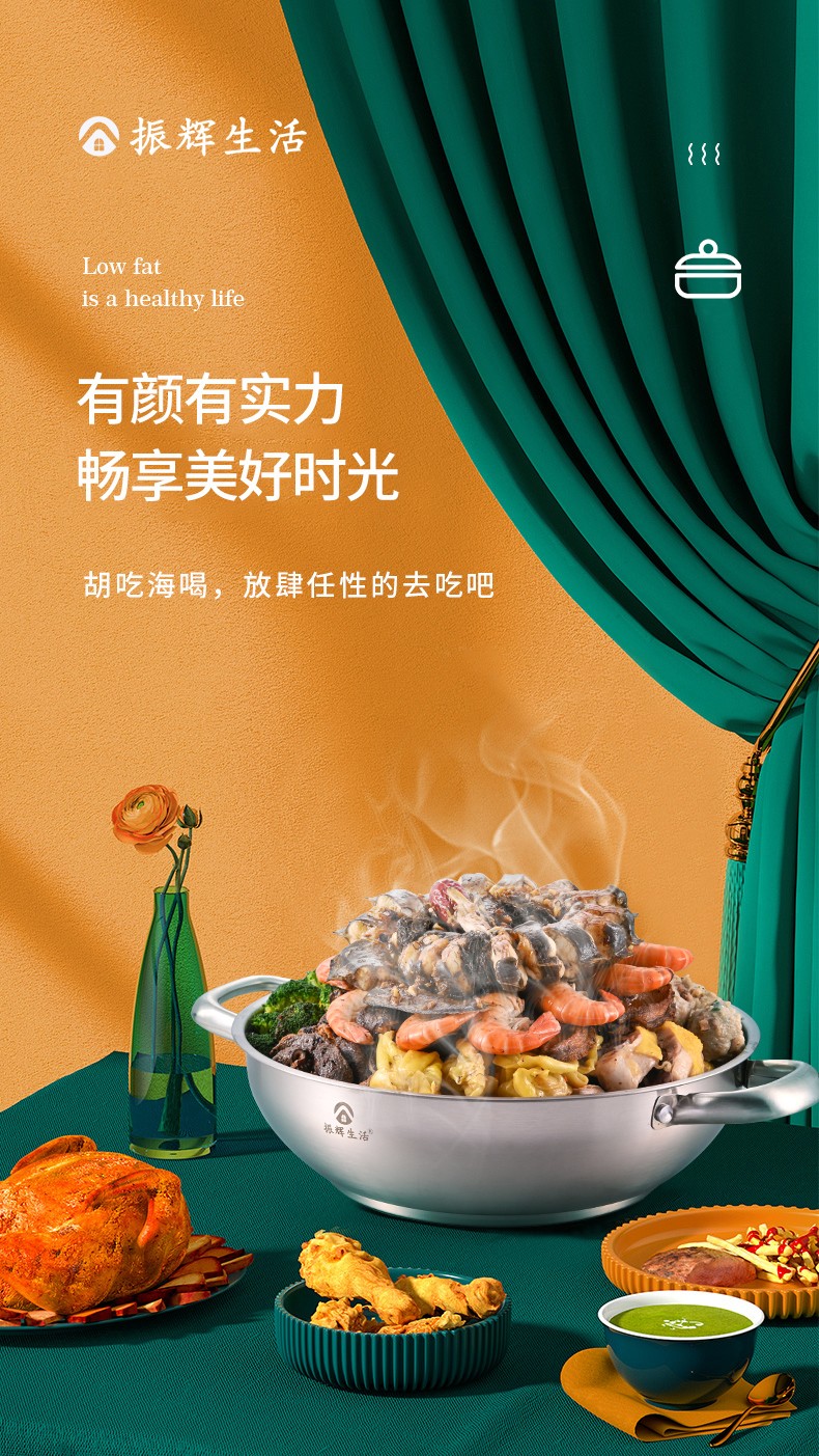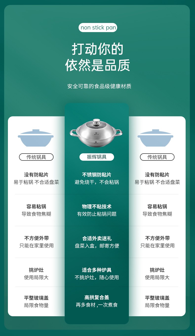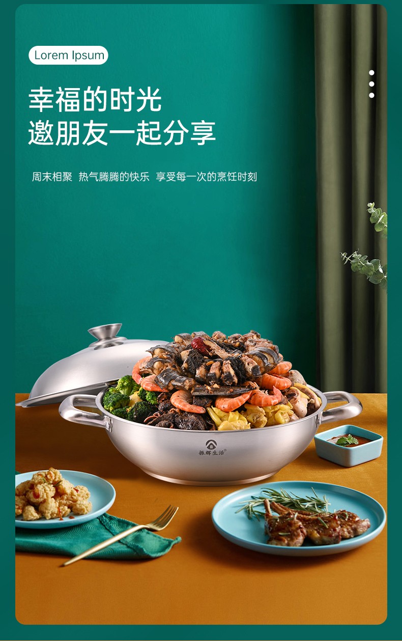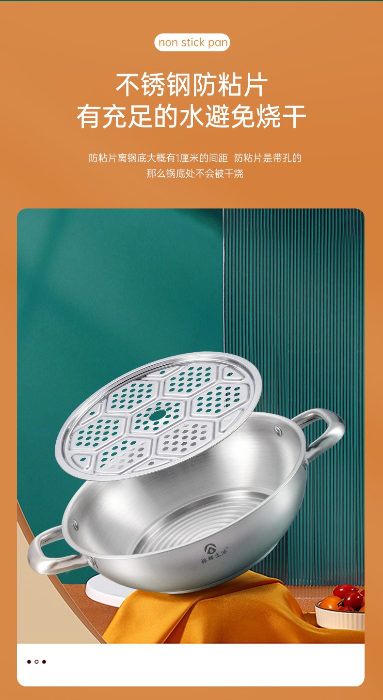 ●可透视不锈钢锅盖,食物情况一清二楚,锅盖提手平面设计,反向平稳放置锅盖,有效避免摇摆摔坏。加大不锈钢锅耳,端锅踏实不拍掉,空心锅耳散热快,有效防烫。