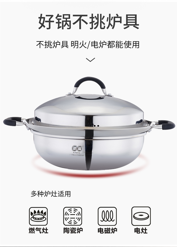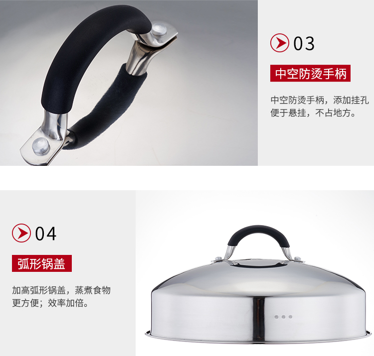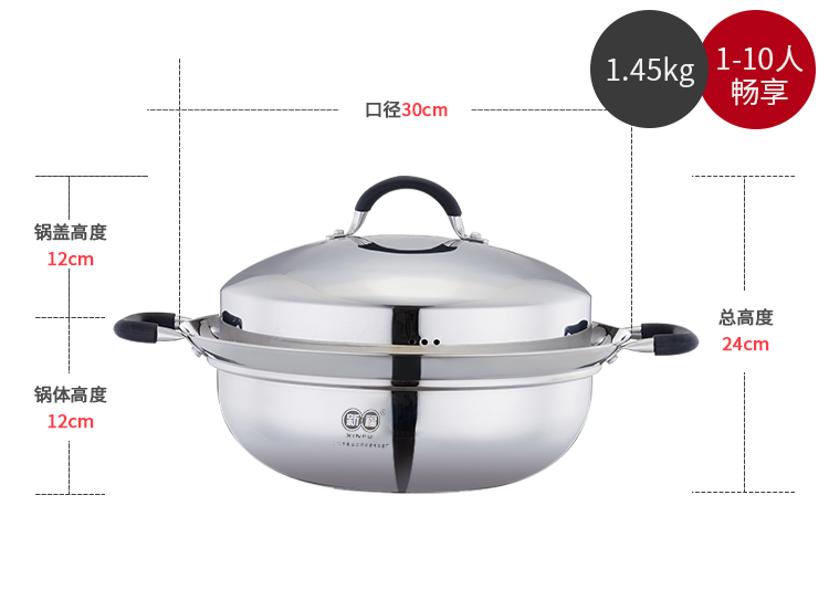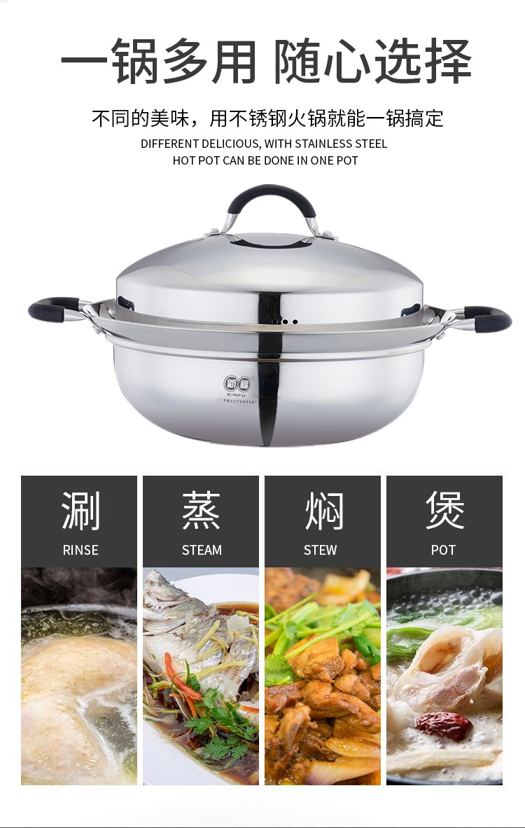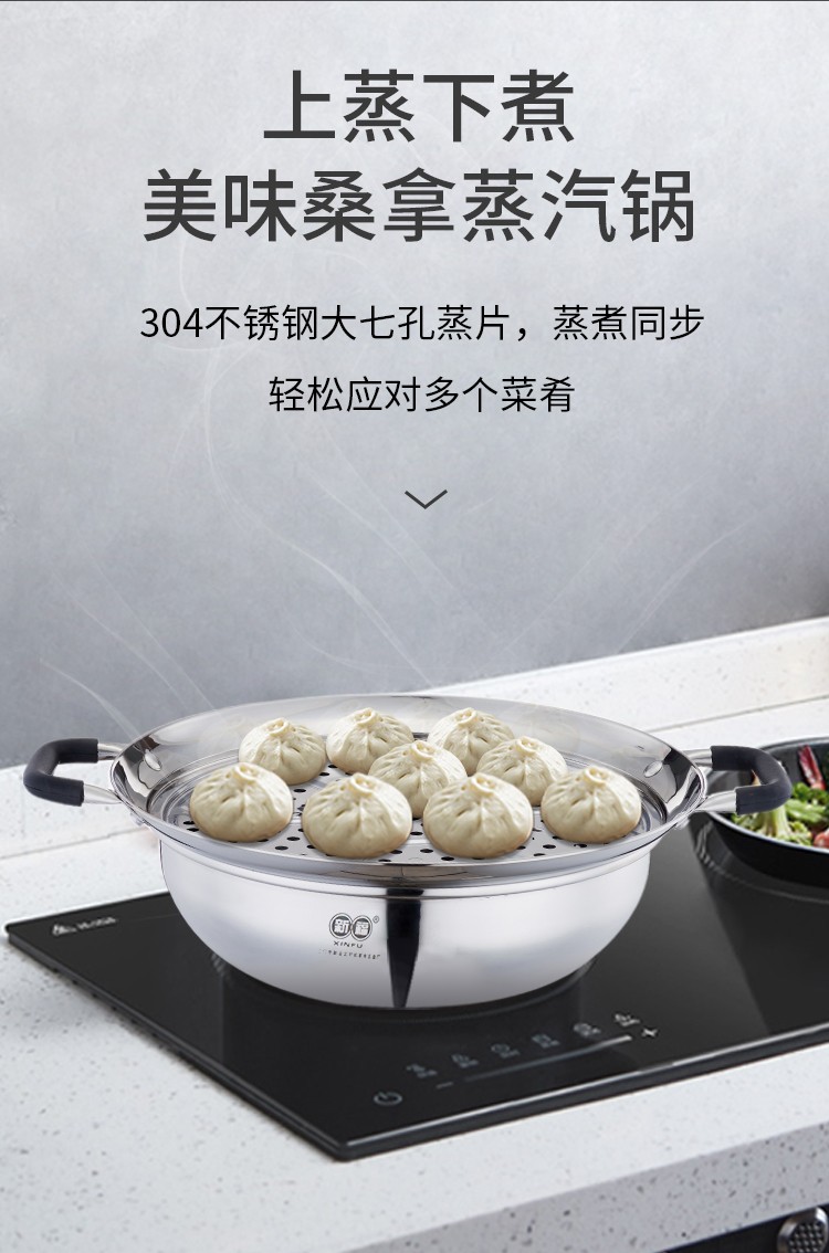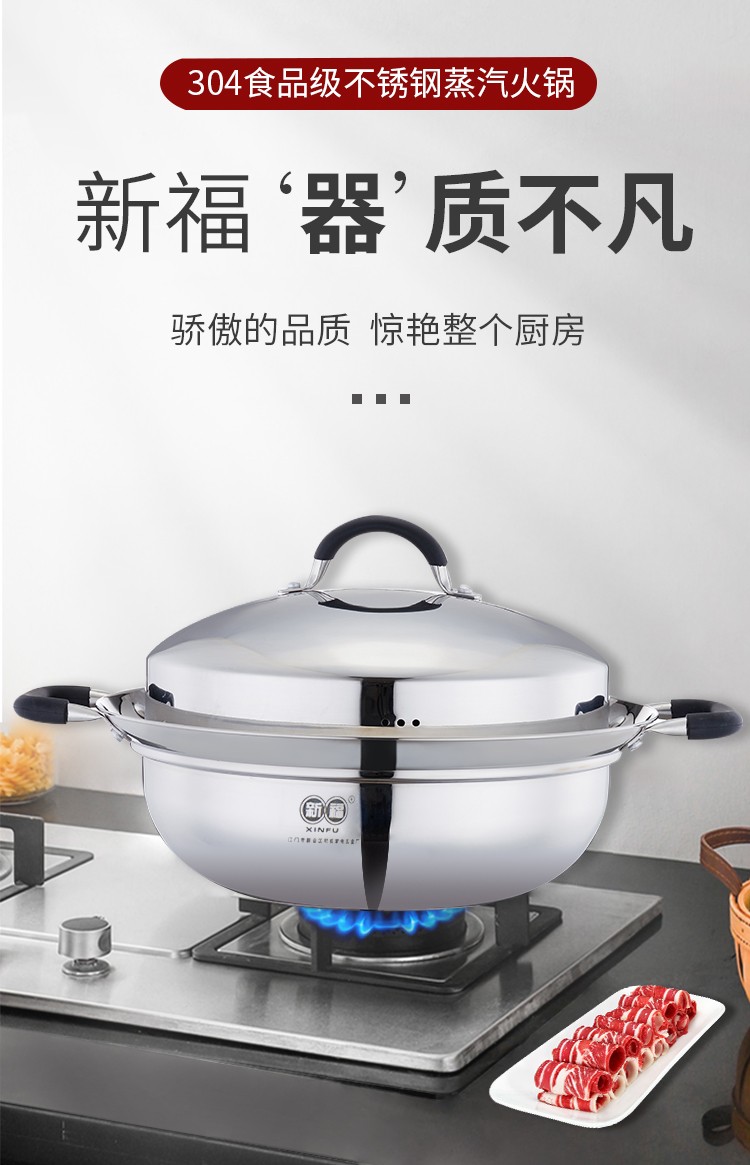 304不锈钢材料制造,创新专利锅边,出现溢锅情况锅边会把水挡住并流回锅内,避免溢锅到处喷的乱象。大小能满足过节人多聚会需求,配上蒸片实现一锅多用,同时上蒸下煮,304不锈钢的高拱型锅盖让蒸格层空间更大不受限制,使用更灵活。同时配备了不锈钢硅胶防烫锅耳,端锅安全实用。是家用和商用餐厅做蒸汽火锅的好选择。