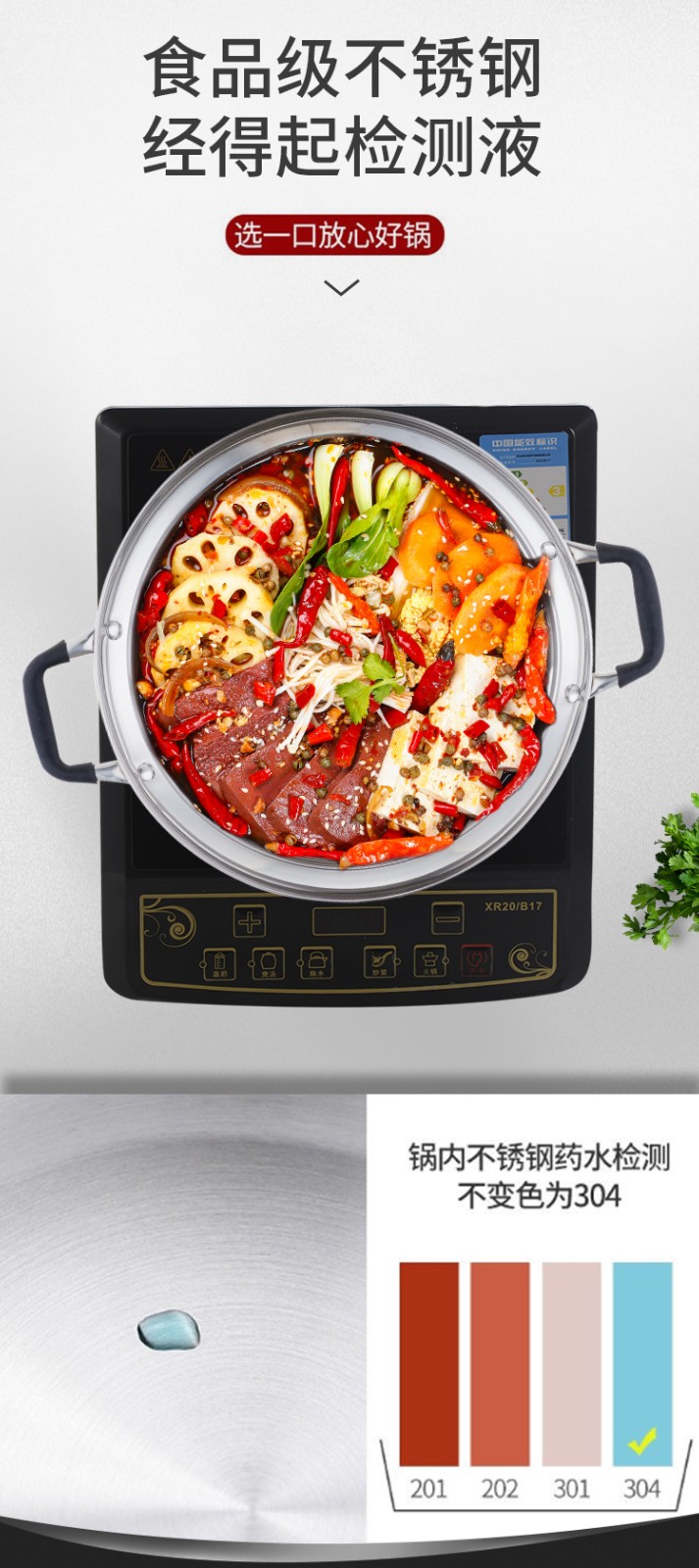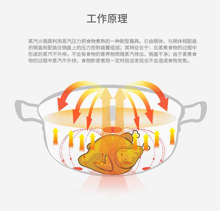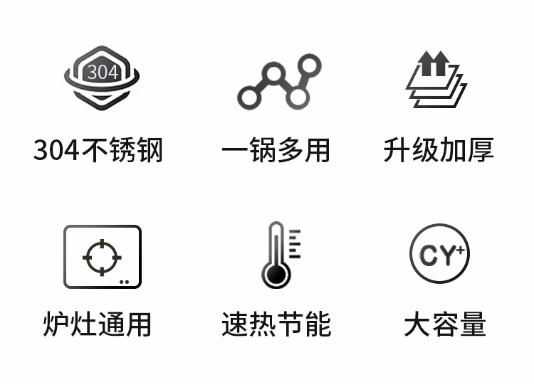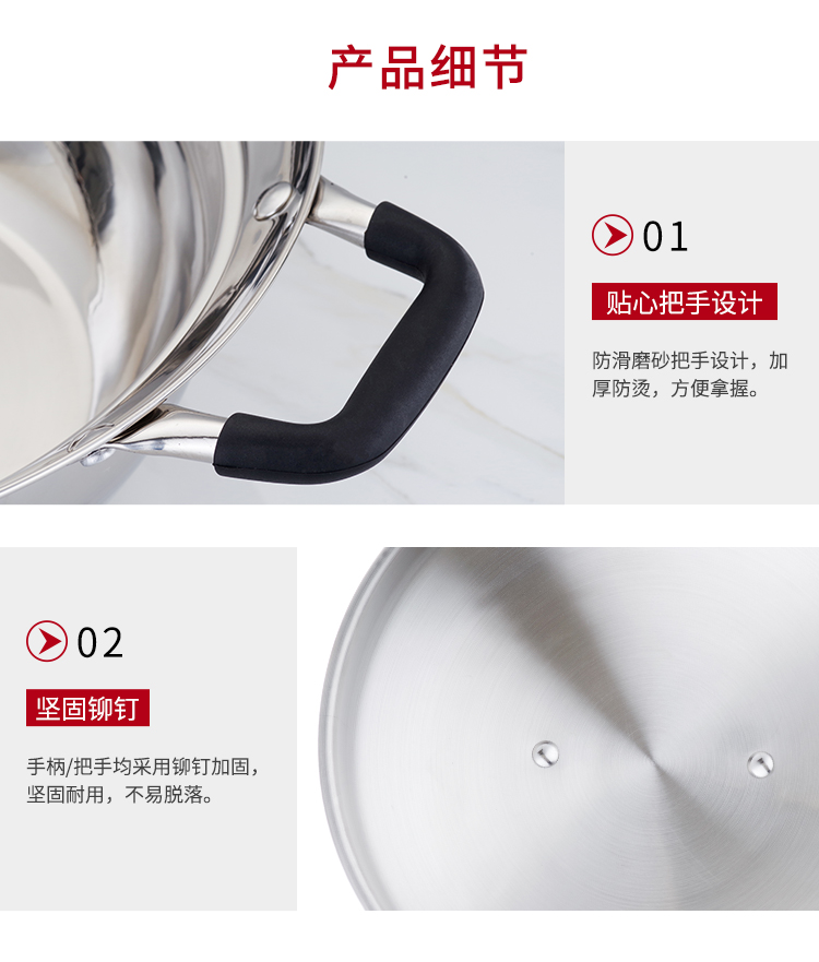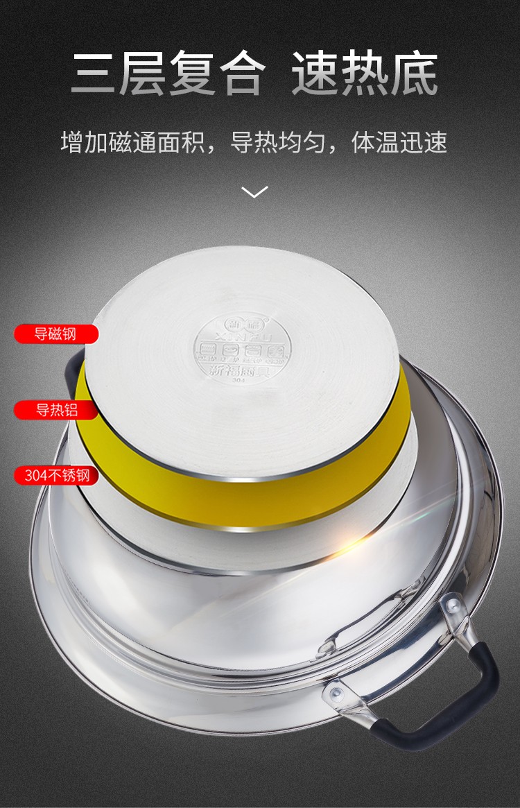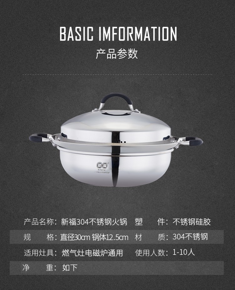 304不锈钢材料制造,创新专利锅边,出现溢锅情况锅边会把水挡住并流回锅内,避免溢锅到处喷的乱象。大小能满足过节人多聚会需求,配上蒸片实现一锅多用,同时上蒸下煮,304不锈钢的高拱型锅盖让蒸格层空间更大不受限制,使用更灵活。同时配备了不锈钢硅胶防烫锅耳,端锅安全实用。是家用和商用餐厅做蒸汽火锅的好选择。